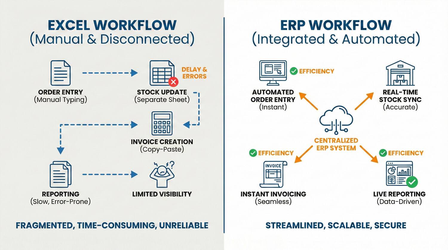 This is the silent tipping point in the ERP vs Excel journey. Excel doesn’t suddenly collapse. Complexity increases gradually until coordination not sales becomes your biggest operational problem.